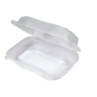 When we say that our Clover™ line of containers are available in a variety of sizes, we mean it. Here we have a clear 9" x 7" hinged rectangle container. This hinged container is perfect to enhance the visualization of both hot and cold food applications. These are leak-resistant and stackable with vented lids to help preserve the presentation and freshness of your food. We also have the 9" x 7" container in black.