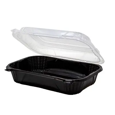 Our ProView™ line is the pinnacle of food service containers. It merges the back-of-house efficiency with positive customer experiences. With clear, vented tops and black bases, the container optimally displays meals. Maintain the freshness of your products while showcasing them beautifully. Here is the large all-purpose hinged container option in the ProView™ line, measuring 9" x 7".