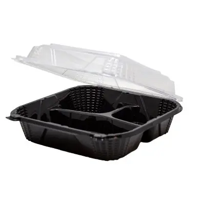 Our ProView™ line is the pinnacle of food service containers. It merges the back-of-house efficiency with positive customer experiences. With clear, vented tops and black bases, the container optimally displays meals. These products are microwave safe, dishwasher safe and recyclable. Here is the medium 3-compartment hinged container option in the ProView™ line, measuring 8" x 8".