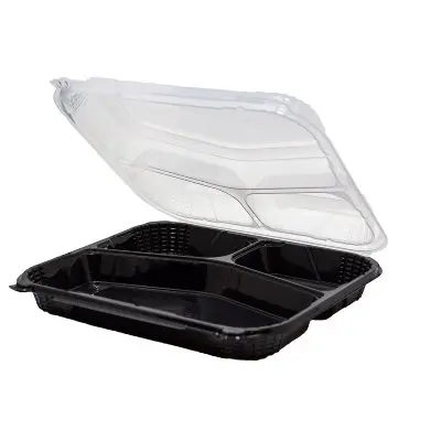 Here is the jumbo 3 compartment close-off container in our ProView™ product line. Measuring 10" x 9", the compartmentalized base and lid helps enhance off-premises operations by keeping food contents in each compartment intact, protecting meal presentation, and helping replicate in-house dining. Microwave and dishwasher safe, ProView™ containers will uphold the integrity and presentation of your food service orders.
