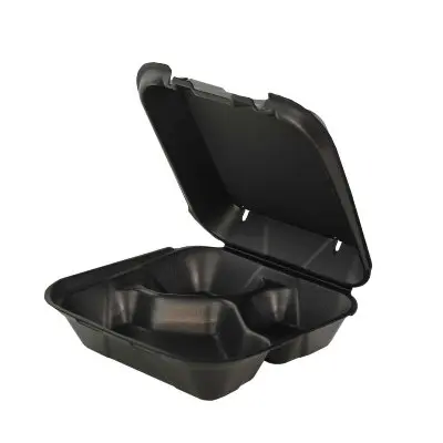 Large, 3 compartment, vented foam hinged container. The SN243-V--3L is a popular item for those looking for a great looking black takeout container. With 3 compartments to keep sauces, gravies, dressings and sides separated, this is perfect for delivery meals. If you are looking for the white version of this 8" x 8" container, be sure to look at the SN243-V.